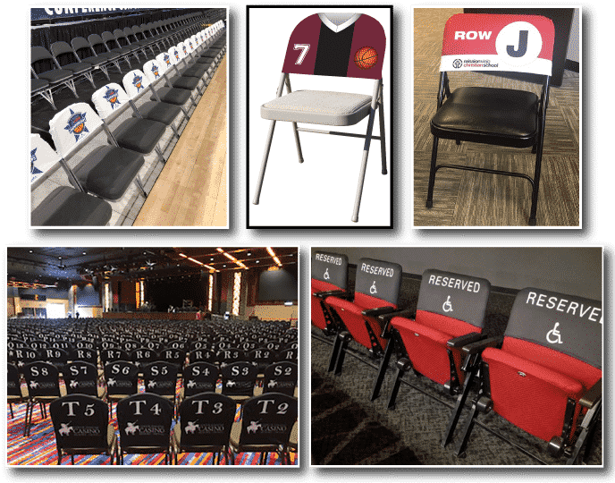 If you need variable data (different logos/names/numbers) on every chair back cover, please call for custom pricing (see picture of multiple seating in the auditorium).